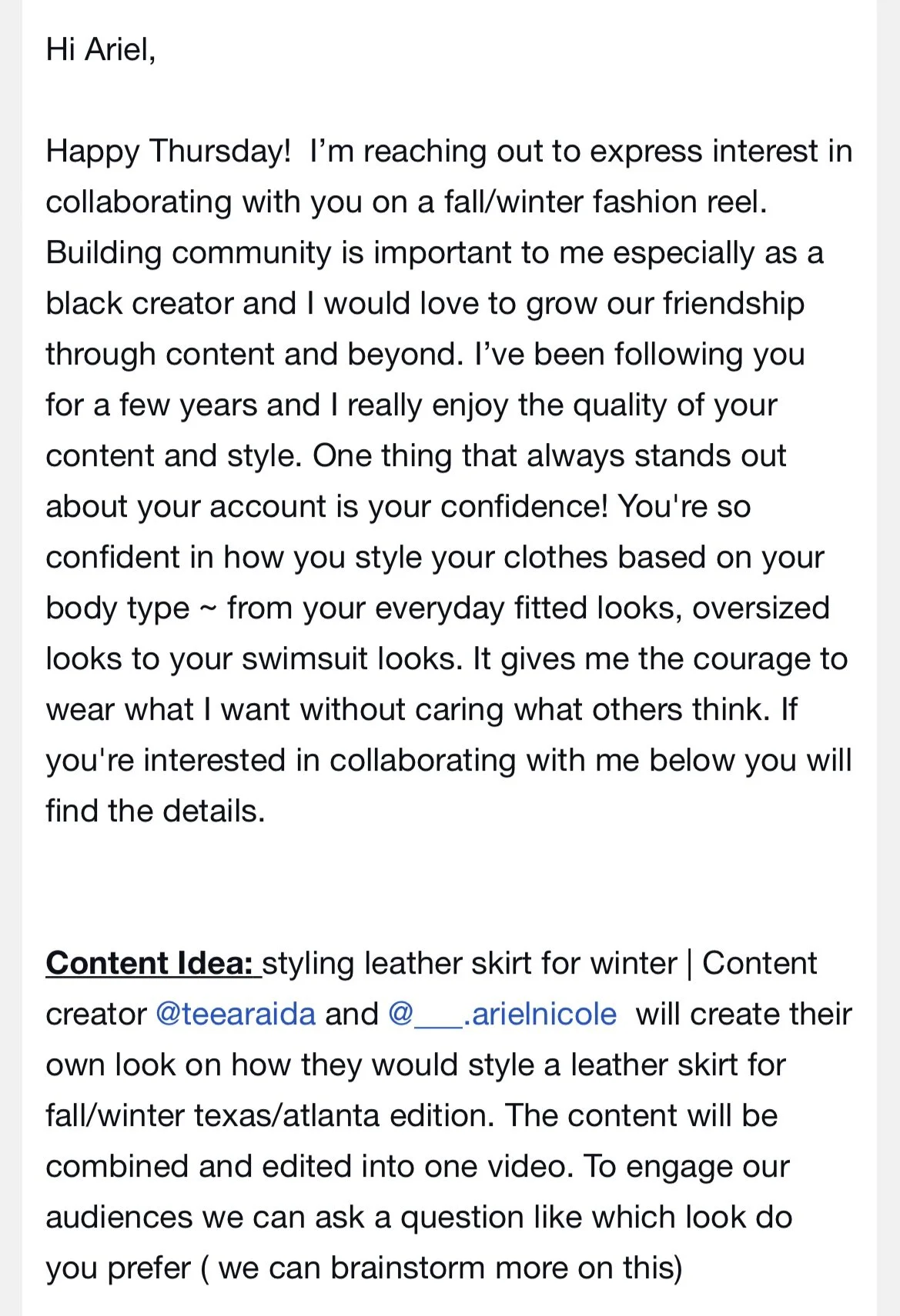 When it comes to working with friends or other creators I like to keep it professional especially when discussing business. This allows them to understand how serious I am about the collaboration. I put together an email that explained the collab idea, content deliverables, location to shoot content, and timeframe. I wanted to treat our collab like a brand collab making sure the email was detailed. This allows us to have a clear understanding of what’s expected of both of us.